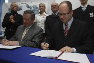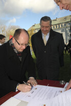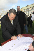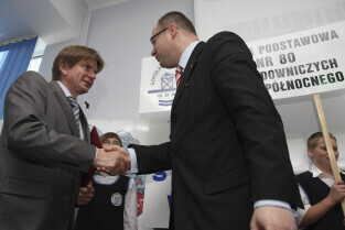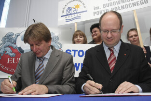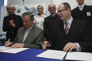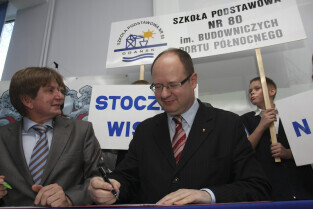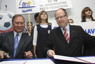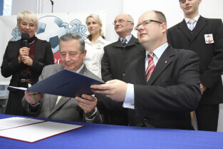 Podpisanie umowów w ramach programu Junior Cup Gdańsk 2012. Gdańsk, Zespół Szkół Budownictwa Okrętowego. Nz. Piotr Soyka, Prezes Stoczni Remontowej S.A. i Paweł Adamowicz, Prezydent Gdańska