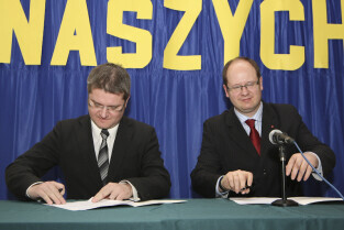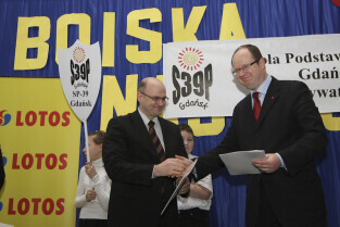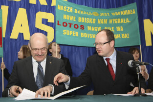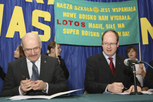 Junior Euro 2012. Podpisanie umów ze sponsorami na modernizację boisk przyszkolnych. Nz. Paweł Olechnowicz (Grupa Lotos) i Paweł Adamowicz (Prezydent Gdańska) - boisko przy SP 61