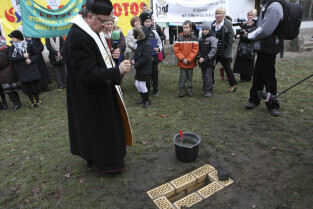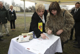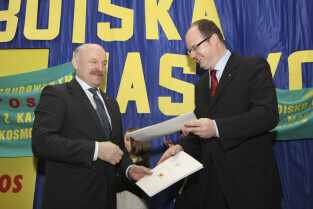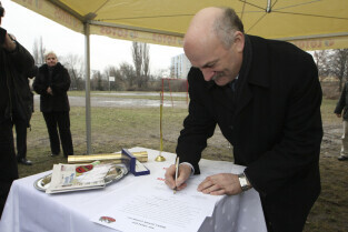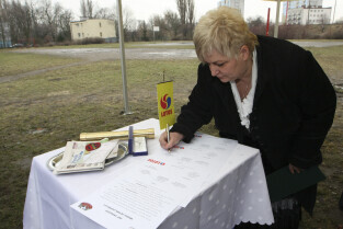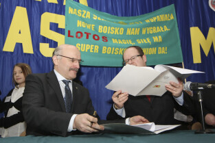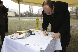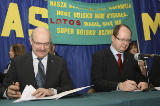 Junior Euro 2012. Podpisanie umów ze sponsorami na modernizację boisk przyszkolnych. Nz. Paweł Olechnowicz Prezes LOTOS S.A. podpisuje akt erekcyjny pod budowę boiska przy SP 61
