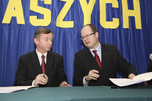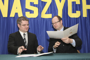 Junior Euro 2012. Podpisanie umów ze sponsorami na modernizację boisk przyszkolnych. Nz. Piotr Augustyniak (ERBUD) i Paweł Adamowicz (Prezydent Gdańska) - boisko przy IX LO