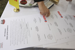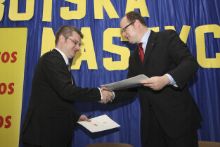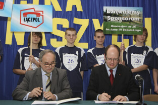 Junior Euro 2012. Podpisanie umów ze sponsorami na modernizację boisk przyszkolnych. Nz. Piotr Wójcik Przewodniczący Samorządu Szkolnego podpisuje akt erekcyjny pod budowę boiska przy SP 61