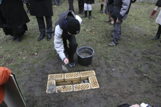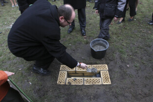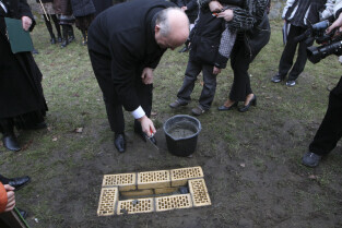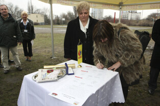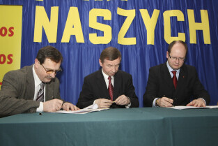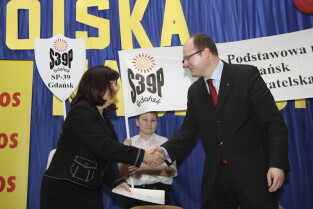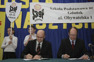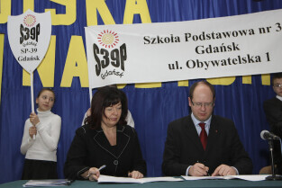 Junior Euro 2012. Podpisanie umów ze sponsorami na modernizację boisk przyszkolnych. Nz. Paweł Adamowicz Prezydent Gdańska podpisuje akt erekcyjny pod budowę boiska przy SP 61