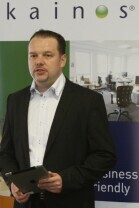 Konferencja prasowa połączona z prezentacją działalności i najnowszego oprogramowania "Evolve" firmy Kainos, działającej w sektorze IT. Gdańsk, CH Madison. Nz. Dyrektor operacyjny gdańskiego oddziału Kainos Szczepan Sakowicz