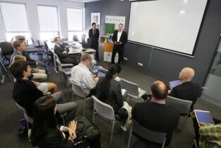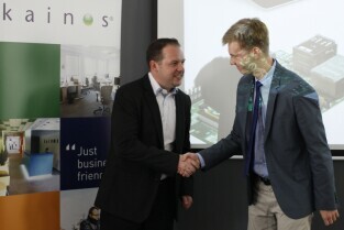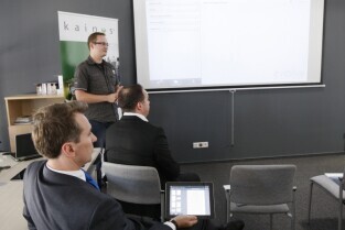 Konferencja prasowa połączona z prezentacją działalności i najnowszego oprogramowania "Evolve" firmy Kainos, działającej w sektorze IT. Gdańsk, CH Madison. Nz. od lewej: Dyrektor operacyjny gdańskiego oddziału Kainos Szczepan Sakowicz, Prezes InvestGDA (Gdańska Agencja Rozwoju Gospodarczego) Alan Aleksandrowicz, Dr inż. Jacek Rumiński z Politechniki Gdańskiej