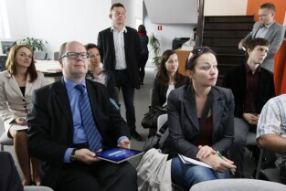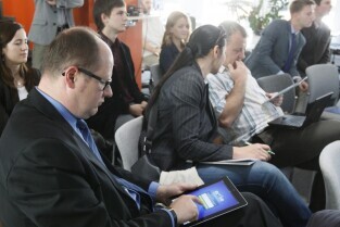 Konferencja prasowa połączona z prezentacją działalności i najnowszego oprogramowania "Evolve" firmy Kainos, działającej w sektorze IT. Gdańsk, CH Madison. Nz. Prezydent Gdańska Paweł Adamowicz