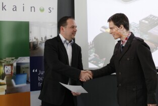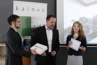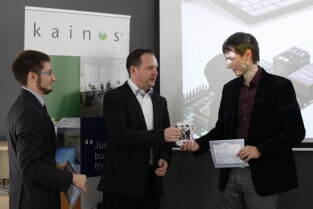 Konferencja prasowa połączona z prezentacją działalności i najnowszego oprogramowania "Evolve" firmy Kainos, działającej w sektorze IT. Gdańsk, CH Madison. Nz. Dyrektor operacyjny gdańskiego oddziału Kainos Szczepan Sakowicz wręcza nagrody laureatom konkursu AppCamp na najlepszą aplikację na platformy Apple