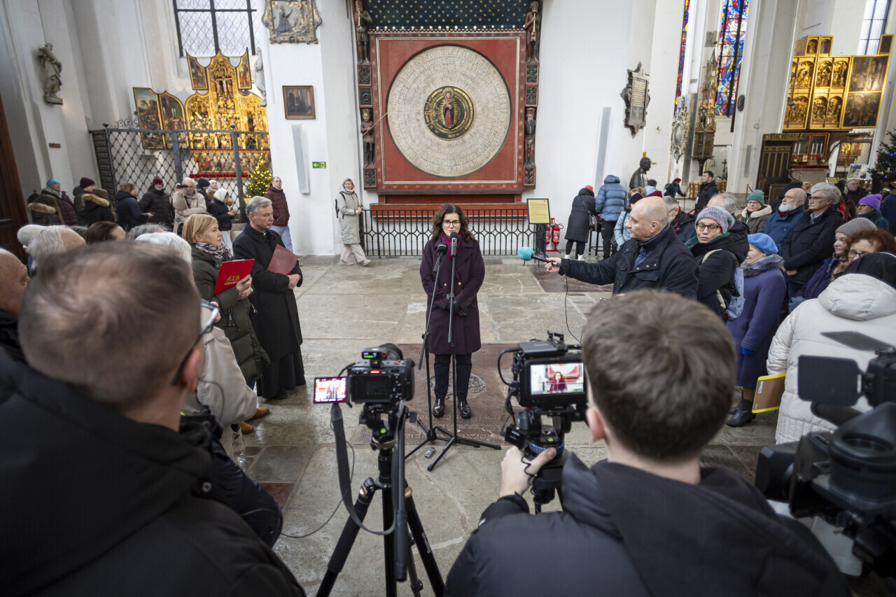 Gdańsk. Zakończyła się naprawa i renowacja 555-letniego zegara astronomicznego w Bazylice Mariackiej w Gdańsku. W konferencjji prasowej dotyczącej renowacji udział wzięli między innymi Aleksandra Dulkiewicz, prezydent Gdańska, ks. prałat Ireneusz Bradtke, budowniczy zegara inż. Grzegorz Szychliński, Pomorski Wojewódzki Konserwator Zabytków Dariusz Chmielewski oraz dr konserwator dzieł sztuki Ewa Lisiak