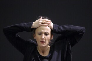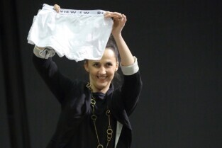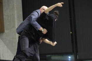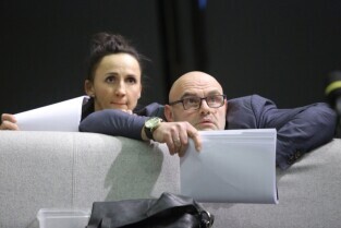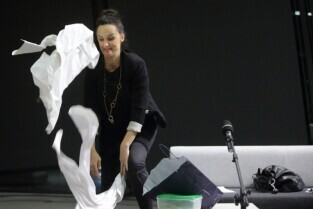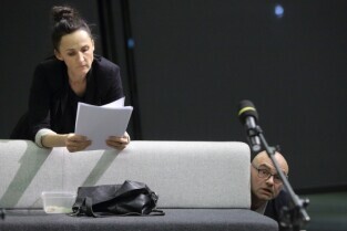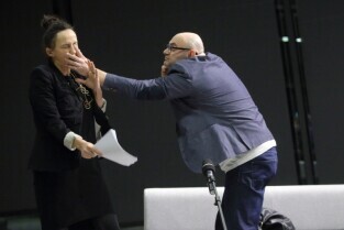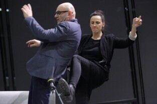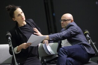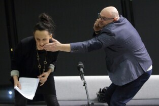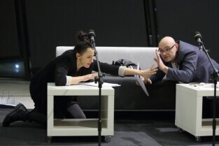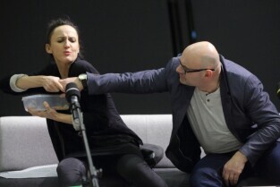 Gdańsk. Europejskie Centrum Solidarności. Gala Otwarcia kampanii społecznej „Międzynarodowy Tydzień Małżeństwa". Nz. Aktorzy Teatru Wybrzeże: Anna Kociarz-Konopińska i Robert Niukiewicz w sztuce performatywnej pt. "Kłopoty Małżeńskie".