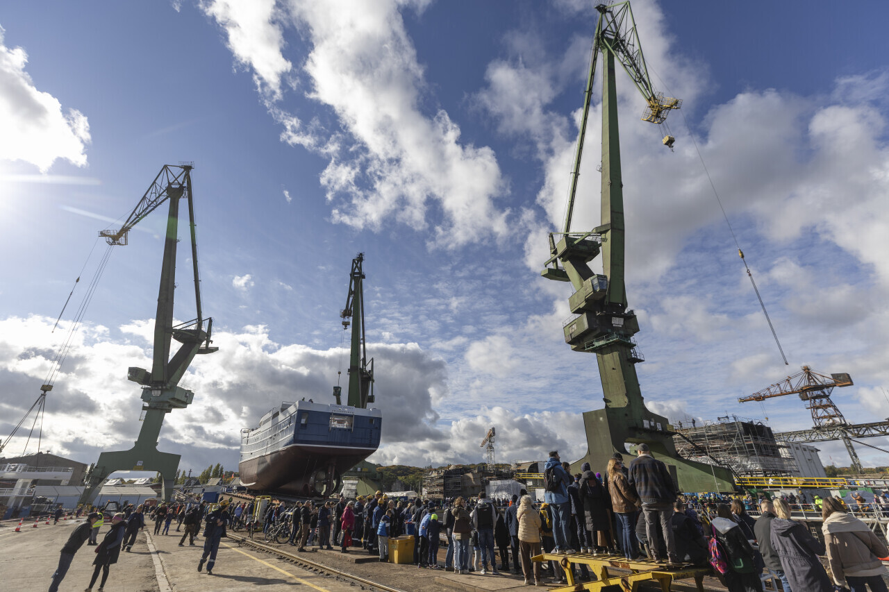 Gdańsk, Karstensen Shipyard Poland. Wodowanie statku rybackiego Chris Andra (numer budowy 489).