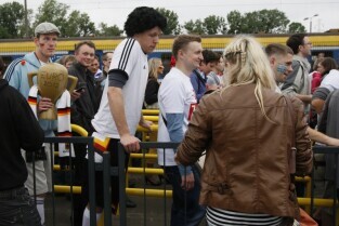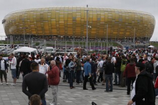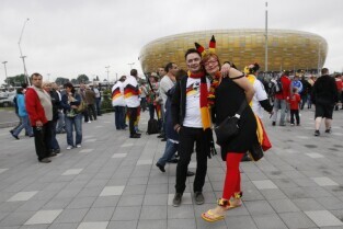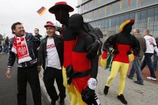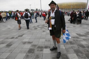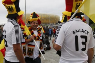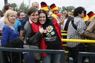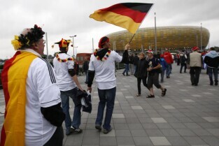 Kibice drużyn narodowych pod stadionem piłkarskim w Gdańsku Letnicy w dniu ćwierćfinałowego meczu UEFA Euro 2012 Grecja-Niemcy