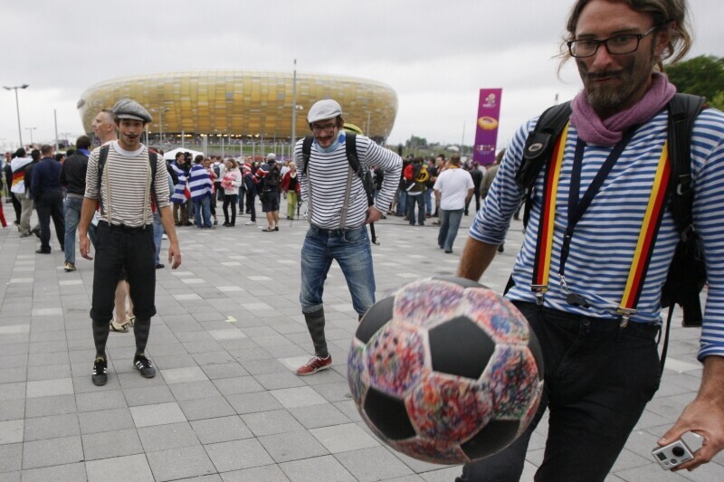 Kibice drużyn narodowych pod stadionem piłkarskim w Gdańsku Letnicy w dniu ćwierćfinałowego meczu UEFA Euro 2012 Grecja-Niemcy