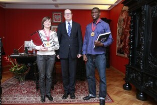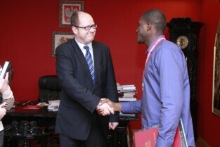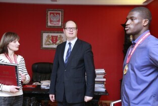 Urząd Miejski w Gdańsku. Złoci medaliści tegorocznych Mistrzostw Europy w kickboxingu, Kamila Bałanda i Ugonoh Izuagbe, z wizytą u Prezydenta Gdańska Pawła Adamowicza.