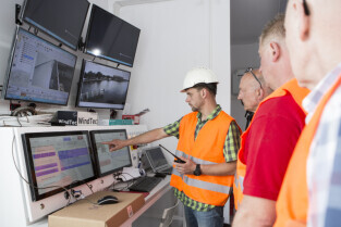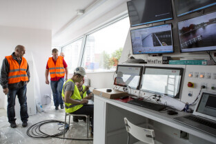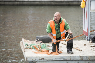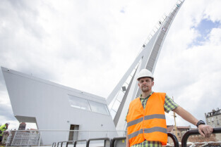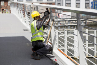 Gdańsk. Ostatnie prace budowlane Kładki nad Motławą. Nz. Tomasz Miąsik - kierownik robót mostowych firmy Intercor