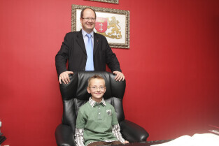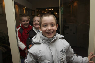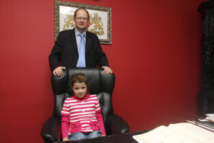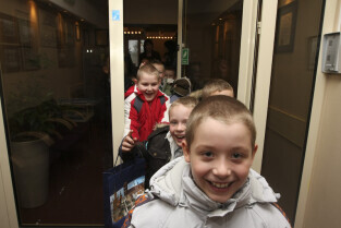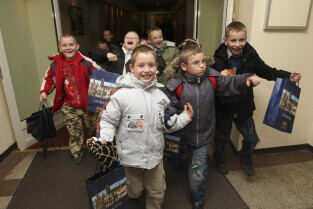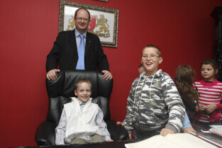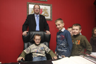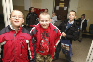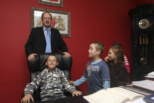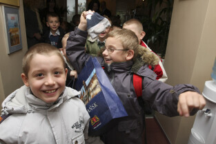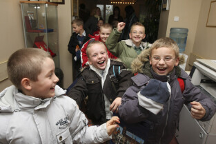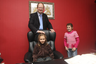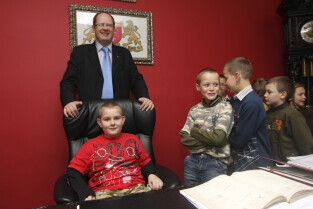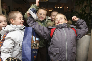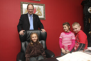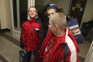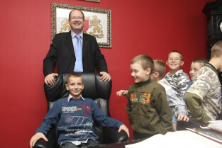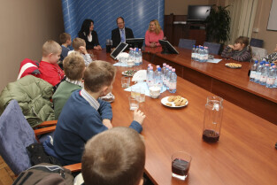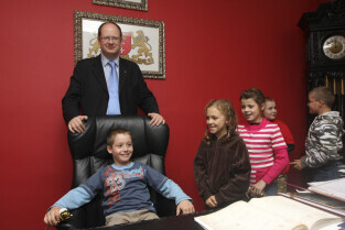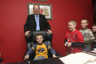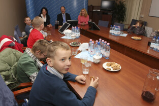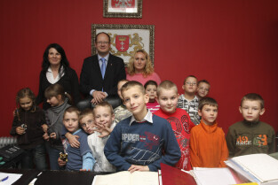 Klasa II ze Szkoły Podstawowej w Żuławskiej miejscowości Suchy Dąb u Prezydenta Gdańska Pawła Adamowicza