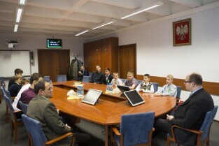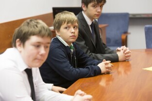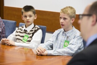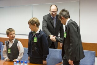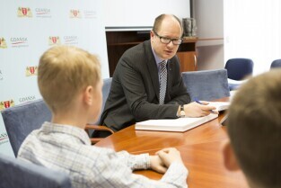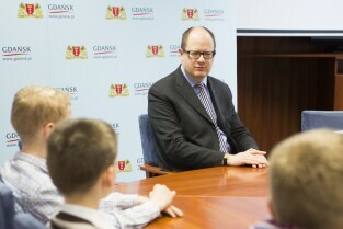 Urząd Miejski w Gdańsku. Klub Dżentelmena z Zespołu Kształcenia Podstawowego i Gimnazjalnego nr 5 w Gdańsku Oruni z wizytą u Prezydenta Gdańska Pawła Adamowicza