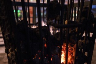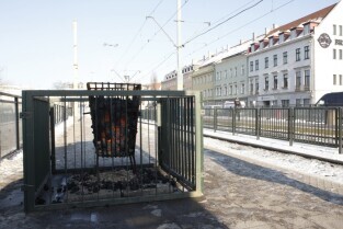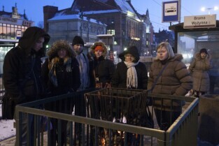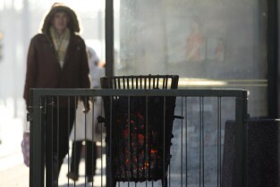 Koksowniki w centrum Gdańska. Ustawione w okolicy przystanków komunikacji miejskiej ogrzewają przemarzniętych pasażerów. Przystanek tramwajowy przy Bramie Wyżynnej.