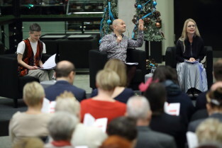 Gdańsk. Kolędowanie w Europejskim Centrum Solidarności. Nz. Anna Fedas-ECS, Partycja Medowska-ECS i Basil Kerski-Dyrektor ECS.