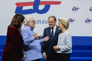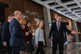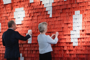 Gdańsk, ECS. Kolegium Komisarzy UE. Umieszczenie przez premiera Donalda Tuska oraz przewodniczącej KE Ursuli von der Leyen zawieszek na ścianie wolności