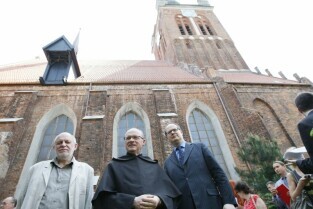 Rozpoczyna się kolejny remont kościoła św. Katarzyny w Gdańsku, zniszczonego w pożarze w 2006 r. W tym etapie gruntownej rekonstrukcji zostanie hełm wieży. Nz. od lewej: Dyrektor MHMG Adam Koperkiewicz, . Nz. Przeor kościoła św. Katarzyny O. Tadeusz Popiela, Prezydent Gdańska Paweł Adamowicz