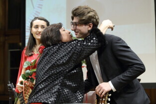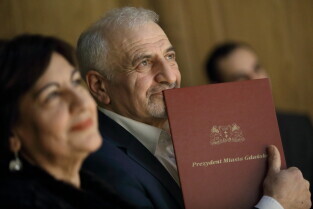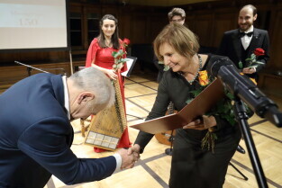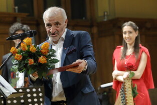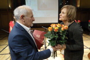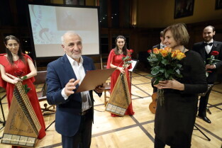 Gdańsk. Ormianie dla Gdańszczan. Koncert dla uczczenia 150. rocznicy urodzin Vardapeta Komitasa, twórcy Ormiańskiej Szkoły Kompozytorskiej. Nz. Nagrodę Prezydenta Miasta Gdańska w dziedzinie Kultury prezesowi Związku Ormian w Gdańsku Gagikowi Parsamianowi wręczała Ewa Rogaczewska z Biura Prezydenta ds. Kultury.