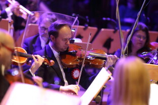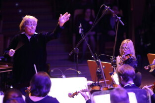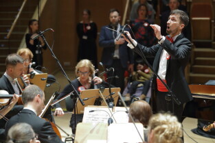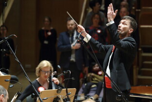Gdańsk. Koncert na 100-lecie z udziałem Leszka Możdżera, Agnieszki Duczmal i Mirosława Baki. Nz. Dyrygent Błażej Połom.