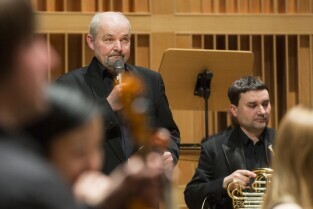 Gdańsk, Filharmonia Bałtycka. "W rytmie Walca". Koncert z okazji Dnia Babci i Dziadka w wykonaniu Bałtyckiej Filharmonii Młodych. Nz. prowadzący Konrad Mielnik