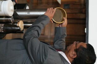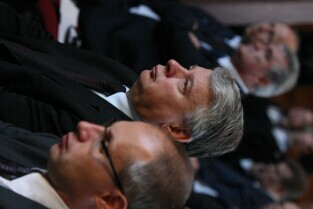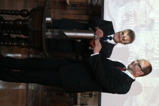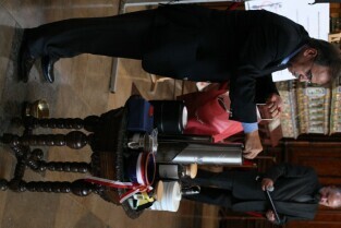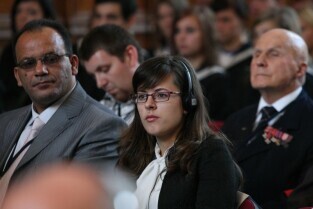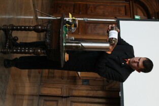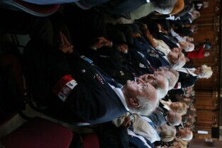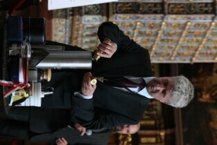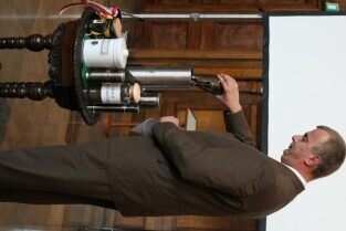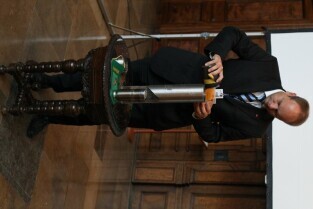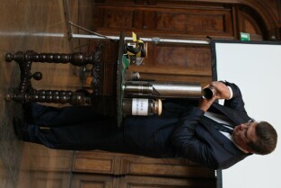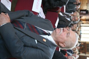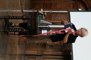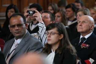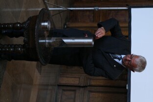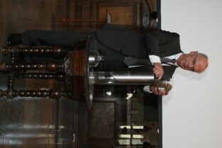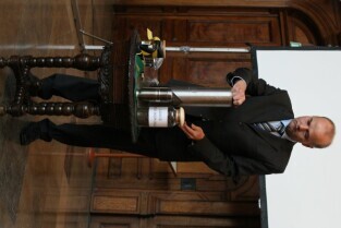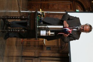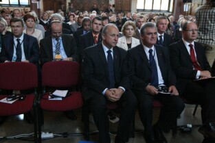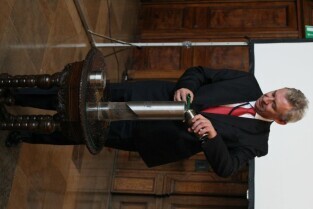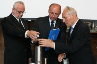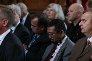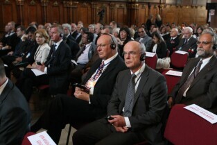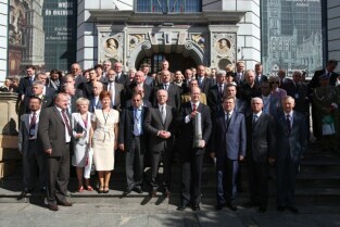 Gdańsk, Dwór Artusa. 70. rocznica wybuchu II Wojny Światowej. Międzynarodowa Konferencja Burmistrzów Miast Pamięci II Wojny Światowej, podczas której do specjalnej urny każda z delegacji wsypała przywiezione ze swoich miast grudki ziemi. Urna zostanie w przyszłości wmurowana w fundament Muzeum II Wojny Światowej. Po konferencj nastąpiło otwarcie wystawy ze zdjęciami zniszczonych / odbudowanych miast.