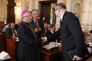 Konferencja "Szanse Oddziałów Terenowych TVP S.A. w dobie telewizji cyfrowej". Gdańsk, Nowy Ratusz. Nz. od lewej: Metropolita Gdański Abp Sławoj Leszek Głódź, Rektor Uniwersytetu Gdańskiego prof. Bernard Lammek, Prezydent Gdańska Paweł Adamowicz