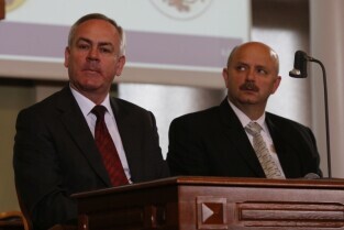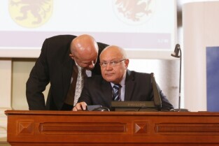 Konferencja "Szanse Oddziałów Terenowych TVP S.A. w dobie telewizji cyfrowej". Gdańsk, Nowy Ratusz. Nz. Prezydent Gdańska Paweł Adamowicz i Członek Zarządu TVP Marian Zalewski (po prawej)