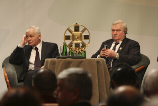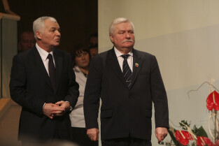 Konferencja Solidarność dla Przyszłości w ramach obchodów 25-lecia przyznania Lechowi Wałęsie Pokojowej Nagrody Nobla. Nz. Jan Krzysztof Bielecki i Lech Wałęsa