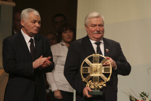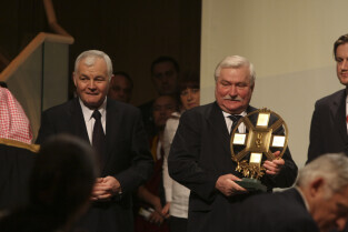 Konferencja Solidarność dla Przyszłości w ramach obchodów 25-lecia przyznania Lechowi Wałęsie Pokojowej Nagrody Nobla. Nz. Lech Wałęsa wręcza Nagrodę Lecha Wałęsy, którą otrzymuje HRH Abdulaziz bin Abdullah al Saud