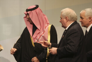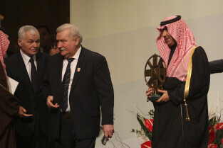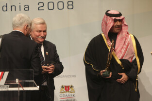 Konferencja Solidarność dla Przyszłości w ramach obchodów 25-lecia przyznania Lechowi Wałęsie Pokojowej Nagrody Nobla. Nz. Lech Wałęsa wręcza Nagrodę Lecha Wałęsy, którą otrzymuje HRH Abdulaziz bin Abdullah al Saud