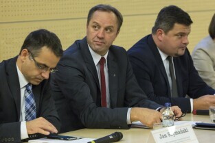 Konferencja "Kształtując Przyszłość" poświęcona efektom wdrażania funduszy europejskich w woj. pomorskim w latach 2007-2013. Gdańsk, Amber Expo. Nz. od lewej: Marszałek Woj. Pomorskiego Mieczysław Struk i Podsekretarz Stanu w Ministerstwie Rozwoju Regionalnego Paweł Orłowski