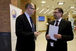 Gdańsk, Filharmonia Bałtycka. Konferencja "Miasta w Internecie" poświęcona roli internetu w działalności samorządów. Podczas konferencji wręczono nagrody "Złota@ 2012 - Samorządowy Lider Cyfrowej Polski", które w otrzymali: Urząd Miejski w Wolsztynie (kategoria gmin miejsko-wiejskich), Urząd Miasta Legionowo (kategoria gmin miejskich), Urząd Miasta Tychy (kategoria gmin miejskich dużych). Nz. Prezydent Gdańska Paweł Adamowicz i Prezes Stowarzyszenia "Miasta w Internecie" Krzysztof Głomb (po prawej)