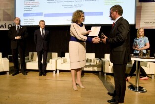Gdańsk, Filharmonia Bałtycka. Konferencja "Miasta w Internecie" poświęcona roli internetu w działalności samorządów. Podczas konferencji wręczono nagrody "Złota@ 2012 - Samorządowy Lider Cyfrowej Polski", które w otrzymali: Urząd Miejski w Wolsztynie (kategoria gmin miejsko-wiejskich), Urząd Miasta Legionowo (kategoria gmin miejskich), Urząd Miasta Tychy (kategoria gmin miejskich dużych). Nz. nagrodę wręcza Prezes Urzędu Komunikacji Elektronicznej Magdalena Gaj