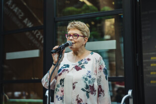 Gdańsk, ECS. Konferencja dotycząca wystawy "Stocznia". Nz. dr Magdalena Staręga