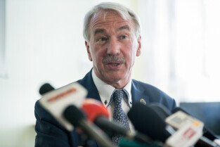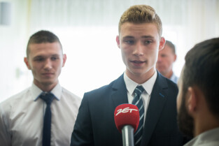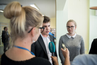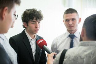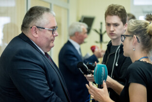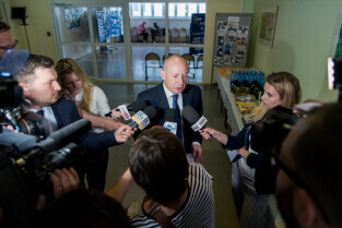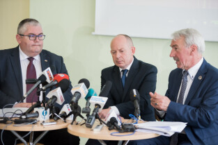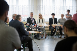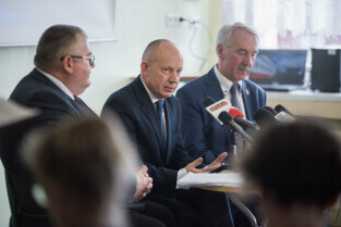Gdańsk, ZSO nr 7 przy ul. Chałubińskiego. Konferencja podsumowująca sprawę zajścia na Chełmie. Nz. od lewej, Piotr Kowalczuk zastępca prezydenta ds. polityki społecznej, Marcin Hintz dyrektor ZSO nr 7, mecenas Roman Nowosielski