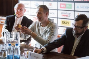 Konferencja prasowa - turniej pożegnalny Magnusa Zetterstroema. Nz Dyrektor: Andrzej Trojanowski - Biuro Prezydenta ds. Sportu, Magnus Zetterstroem, Maciej Polny