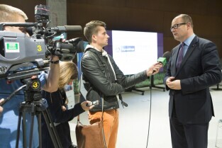 Gdańsk, ECS. Konferencja prasowa ThyssenKrupp, podczas której oficjalnie ogłoszono powstanie inwestycji z sektora usług wspólnych w Gdańsk. Nz. Lars Holzer (Head of Global ThyssenKrupp Shared Services)