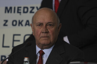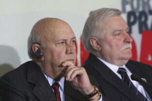 Konferencja prasowa poświęcona obchodom 25-lecia przyznania Lechowi Wałęsie Pokojowej Nagrody Nobla. Gdańsk, Filharmonia Bałtycka. 05.12.2008. Nz. od lewej: Frederik Willem De Klerk (B. Prezydent RPA), Lech Wałęsa (B. Prezydent RP)
