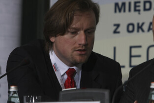 Konferencja prasowa poświęcona obchodom 25-lecia przyznania Lechowi Wałęsie Pokojowej Nagrody Nobla. Gdańsk, Filharmonia Bałtycka. 05.12.2008. Nz. Piotr Gulczyński (Instytut Lecha Wałęsy)