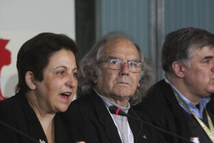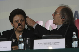 Konferencja prasowa poświęcona obchodom 25-lecia przyznania Lechowi Wałęsie Pokojowej Nagrody Nobla. Gdańsk, Filharmonia Bałtycka. 05.12.2008. Nz. od lewej: Shrin Ebadi (laureat Pokojowej Nagrody Nobla), Adolfo Perez Esquivel (laureat Pokojowej Nagrody Nobla), O. Maciej Zięba (ECS)