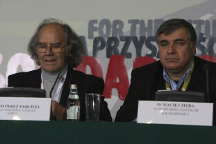 Konferencja prasowa poświęcona obchodom 25-lecia przyznania Lechowi Wałęsie Pokojowej Nagrody Nobla. Gdańsk, Filharmonia Bałtycka. 05.12.2008. Nz. od lewej: Adolfo Perez Esquivel (laureat Pokojowej Nagrody Nobla), O. Maciej Zięba (ECS)