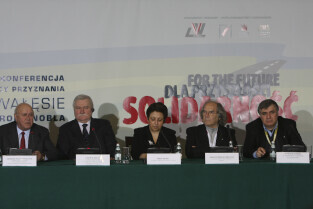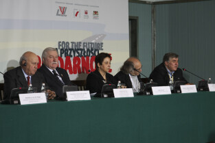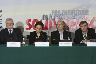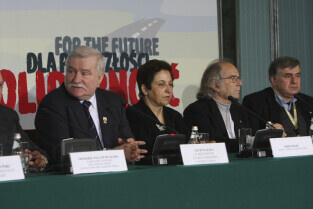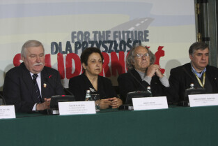 Konferencja prasowa poświęcona obchodom 25-lecia przyznania Lechowi Wałęsie Pokojowej Nagrody Nobla. Gdańsk, Filharmonia Bałtycka. 05.12.2008. Nz. od lewej: Lech Wałęsa (B. Prezydent RP), Shrin Ebadi (laureat Pokojowej Nagrody Nobla), Adolfo Perez Esquivel (laureat Pokojowej Nagrody Nobla), O. Maciej Zięba (ECS)