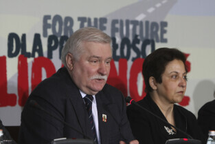 Konferencja prasowa poświęcona obchodom 25-lecia przyznania Lechowi Wałęsie Pokojowej Nagrody Nobla. Gdańsk, Filharmonia Bałtycka. 05.12.2008. Nz. od lewej: Lech Wałęsa (B. Prezydent RP), Shrin Ebadi (laureat Pokojowej Nagrody Nobla)