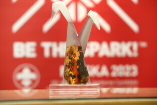 Gdańsk. Konferencja w sprawie Światowego Jamboree Skautowego w 2023. Pt. Czy Gdańsk zostanie gospodarzem Światowego Jamboree Skautowego w 2023? Nz. Statuetka Bursztynowa.