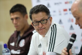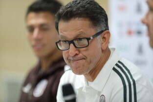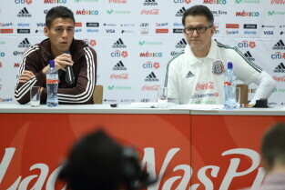 Gdańsk. Konferencje prasowe i treningi przed meczem Polska-Meksyk. Konferencja prasowa reprezentacji Meksyku. Nz. Juan Carlos Osorio, Hector Moreno.