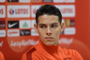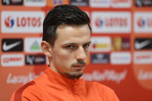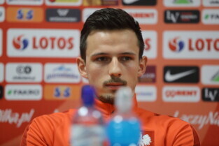Gdańsk. Konferencje prasowe i treningi przed meczem Polska-Meksyk. Konferencja prasowa reprezentacji Polski. Nz. Mariusz Stępiński.