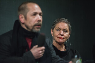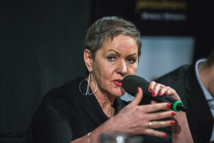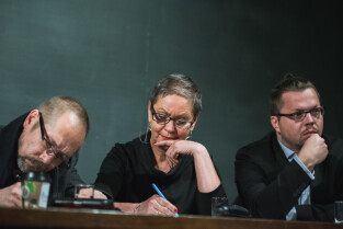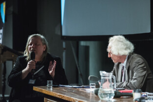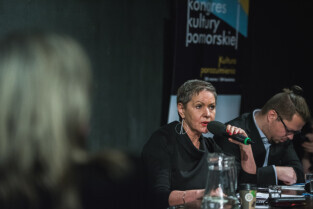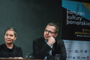 Gdańsk. Teatr Wybrzeże. Kongres Kultury Pomorskiej. Nz. prof. dr hab. Przemysław Czapliński (Uniwersytet im. Adama Mickiewicza w Poznaniu) i po prawej Krystyna Danilecka-Wojewódzka (wiceprezydent Słupska)