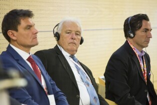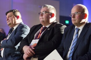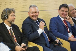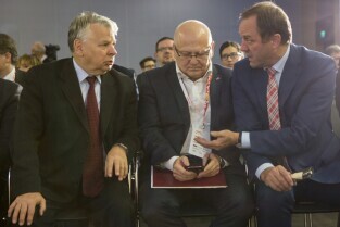 Gdańsk, Amber Expo. Międzynarodowy Kongres Smart Metropolia. Nz. od lewej: Marszałek Senatu RP Bogdan Borusewicz, Z-ca Prezydenta Gdańska Wiesław Bielawski, Marszałek Woj. Pomorskiego Mieczysław Struk